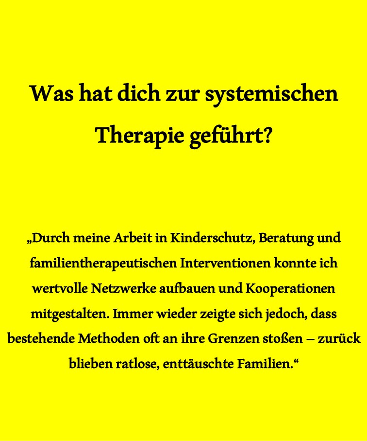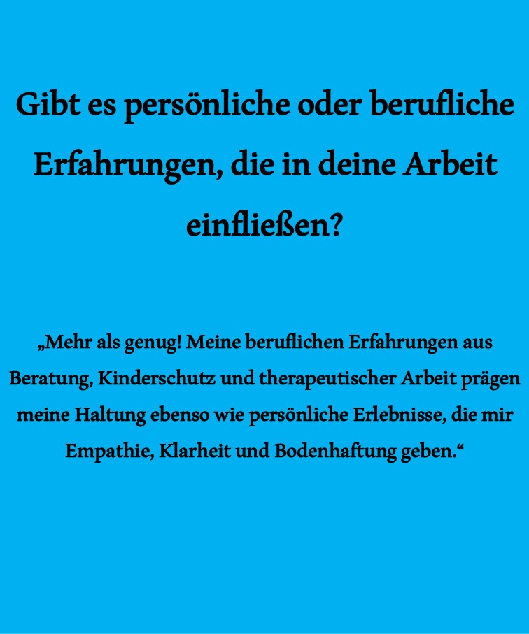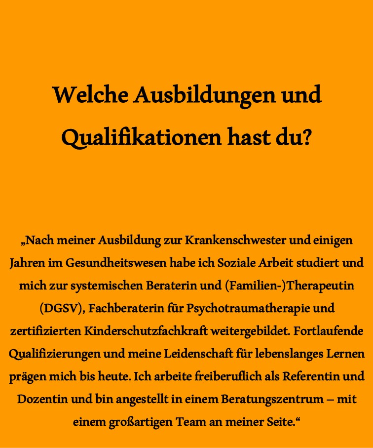 Heute arbeite ich als systemische Beraterin. Fachlich begleite ich Menschen mit Herz, Struktur und einem ganzheitlichen Blick. Durch zahlreiche Weiterbildungen, etwa in Traumapädagogik, systemischer Therapie und Kinderschutz, entwickle ich mich kontinuierlich weiter – immer mit dem Ziel, Menschen in ihrer persönlichen Entwicklung bestmöglich zu unterstützen.